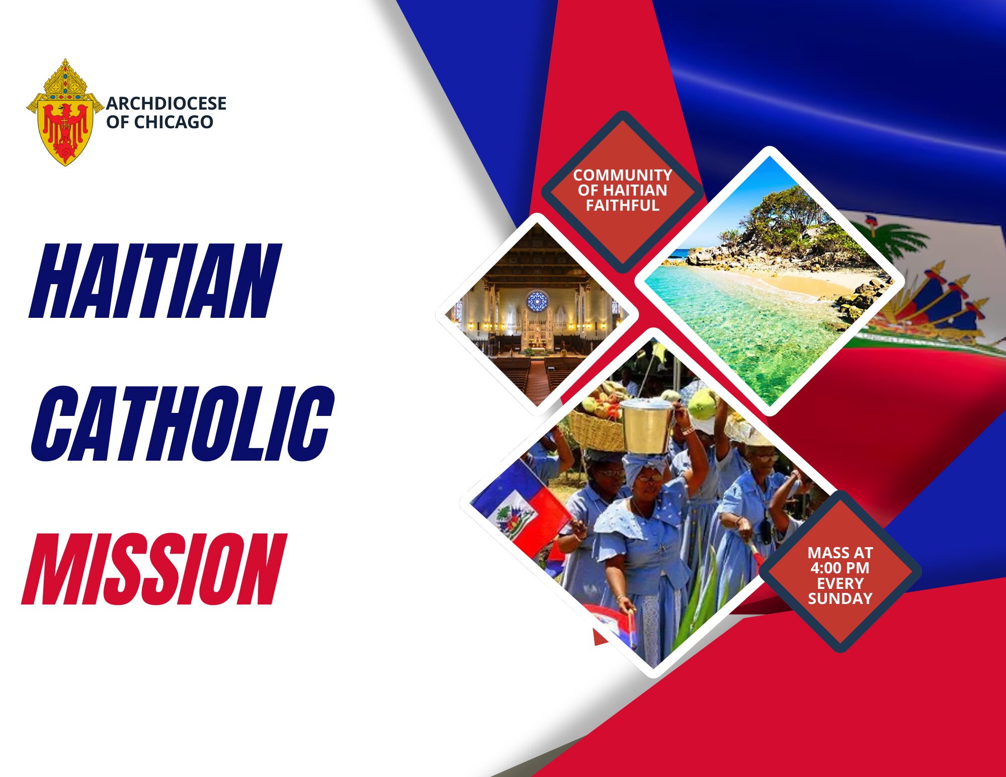 La Mission Catholique Haïtienne est une entité paroissiale de l’Archidiocèse de Chicago. En suivant les orientations pastorales et les procédures de l’Archidiocèse, la Mission répond aux besoins spirituels des catholiques haïtiens tout en partageant la richesse de la foi et de la culture haïtiennes avec l’Église locale.